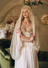 • 不規則な花びら型のネックラインに金糸で刺繍された鳥、精緻で細かいディテール。